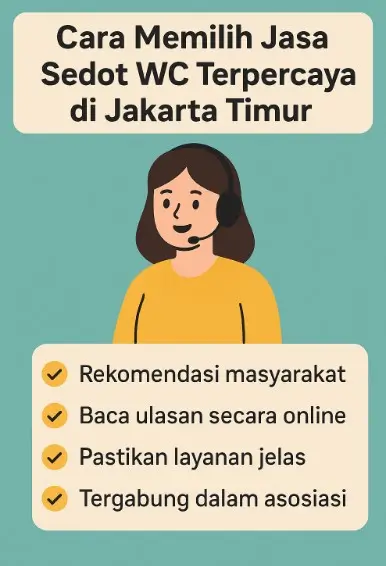 Memilih layanan sedot WC yang aman di Jakarta Timur tak bisa sembarangan. Jangan hanya tergiur harga murah. Pastikan kamu mengecek legalitas, ulasan pelanggan, dan kualitas layanan. Dengan begitu, kamu bisa terhindar dari masalah baru dan septic tank pun terawat dengan aman dan benar.