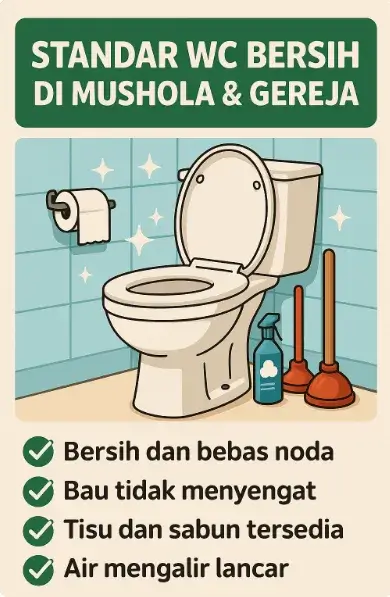Tempat ibadah seperti mushola dan gereja adalah ruang spiritual sekaligus sosial. Jamaah dan jemaat tidak hanya hadir untuk berdoa, tetapi juga berinteraksi dalam berbagai kegiatan. Maka dari itu, fasilitas seperti WC harus dijaga kebersihannya demi menciptakan suasana ibadah yang nyaman dan higienis.