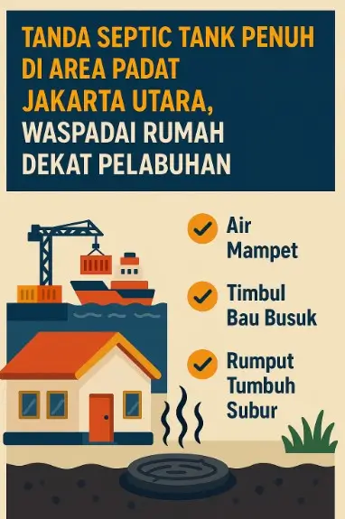 Rumah di area padat Jakarta Utara—terutama yang berdekatan dengan pelabuhan atau dermaga—rentan mengalami gangguan sanitasi. Kepadatan bangunan membuat lahan resapan terbatas, pipa pembuangan kerap berbelok tajam, dan akses armada layanan kerap terhambat. Kombinasi faktor tersebut membuat septic tank lebih cepat menumpuk lumpur dan gas, sementara tanda-tanda awal sering terlewat.