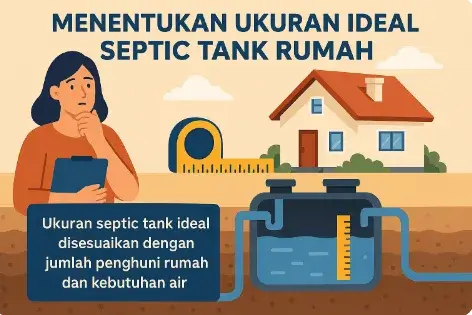 Menentukan ukuran septic tank rumah tidak boleh sembarangan. Kapasitas tangki harus disesuaikan dengan jumlah penghuni, volume limbah, dan kondisi lahan. Rumah tangga kecil cukup dengan kapasitas 1.000–1.500 liter, sedangkan hunian padat membutuhkan minimal 3.000 liter.