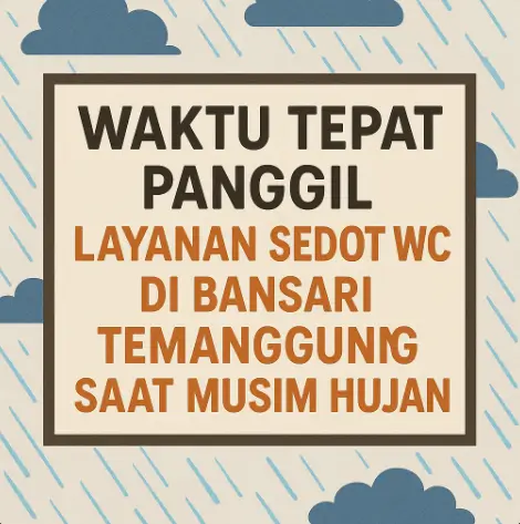 Curah hujan tinggi di Bansari Temanggung menyebabkan daya resap tanah menurun sehingga septic tank lebih cepat penuh. Menentukan waktu tepat untuk penyedotan, menjaga jadwal pembersihan rutin, dan mengenali tanda-tanda septic tank penuh adalah langkah penting untuk mencegah WC meluap. Dengan layanan profesional, Anda bisa memastikan sanitasi rumah tetap aman dan nyaman sepanjang musim hujan.