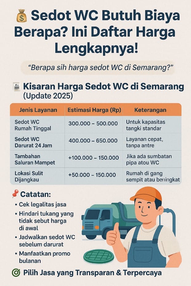 Untuk menghindari biaya tidak terduga, pilihlah layanan sedot WC profesional di Semarang yang memberikan estimasi harga di awal dan memiliki reputasi jelas. Hindari tukang abal-abal yang menawarkan harga super murah seperti “Rp50.000” tapi ujungnya meminta jutaan rupiah karena biaya tambahan fiktif.